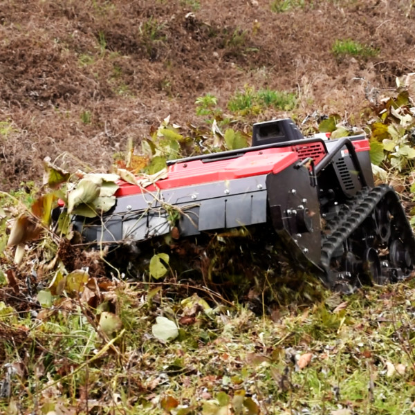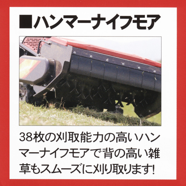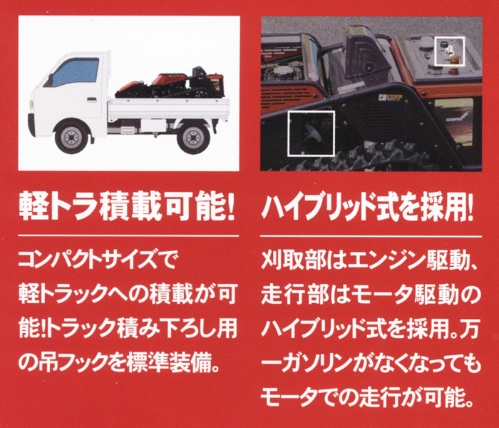 コンパクトなボディは軽トラ積載可能。エンジン刈取+バッテリー走行のハイブリッドで安定した作業を実現。最大作業角度は全方位30°。クローラによりその場での旋回も可能。38枚刃のハンマーナイフモアが背丈150cm程度の草でも刈り取ります。なによりもラジコン操作なのでハンドルを持たなくていいのが最大の特徴!作業による疲れを大幅に軽減します。